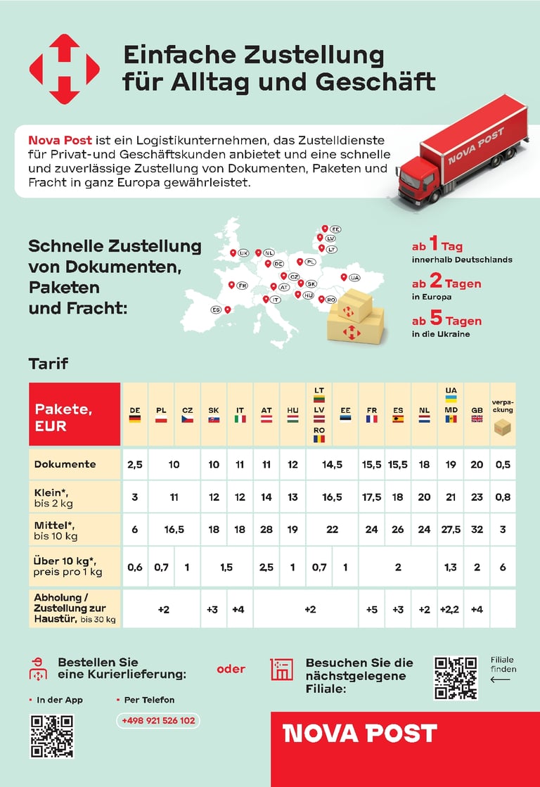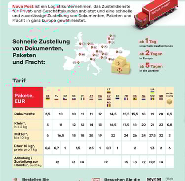 Hier können Sie ein Paket per Nova Post nach Deutschland, in die Ukraine, nach Frankreich, in die Niederlande, nach Italien, Spanien, Österreich, Estland, Lettland, Litauen, Tschechien, die Slowakei, Polen, Ungarn, Rumänien und das Vereinigte Königreich versenden sowie Pakete aus diesen Ländern empfangen. Alle Pakete sind bis 500 Euro versichert. Das Paketgewicht beträgt maximal 30 kg. Der Preis richtet sich nach Zielland, Gewicht und Größe des Pakets.