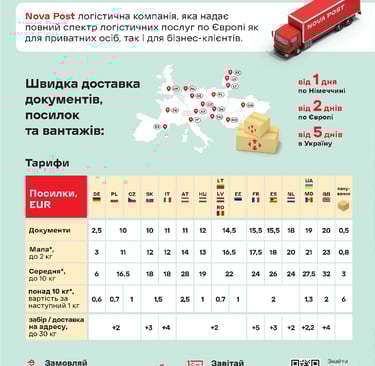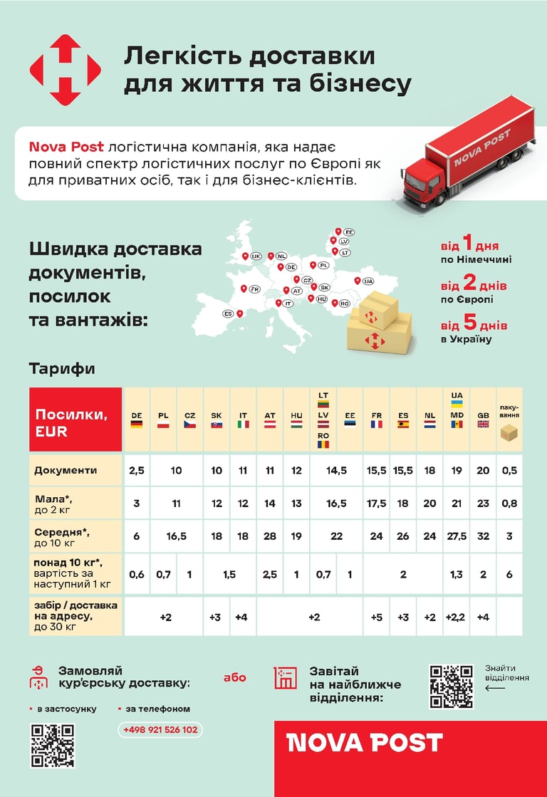 Здесь Вы можете выслать посылку через Nova Post в Германию, Украину, Францию, Нидерланды, Италию, Испанию, Австрию, Эстонию, Латвию, Литву, Чехию, Словакию, Польшу, Венгрию, Румынию и Великобританию, а также получать посылки из этих стран. Все посылки застрахованы до 500 евро. Вес посылки – не более 30 кг. Цена зависит от страны назначения, веса и размера посылки.